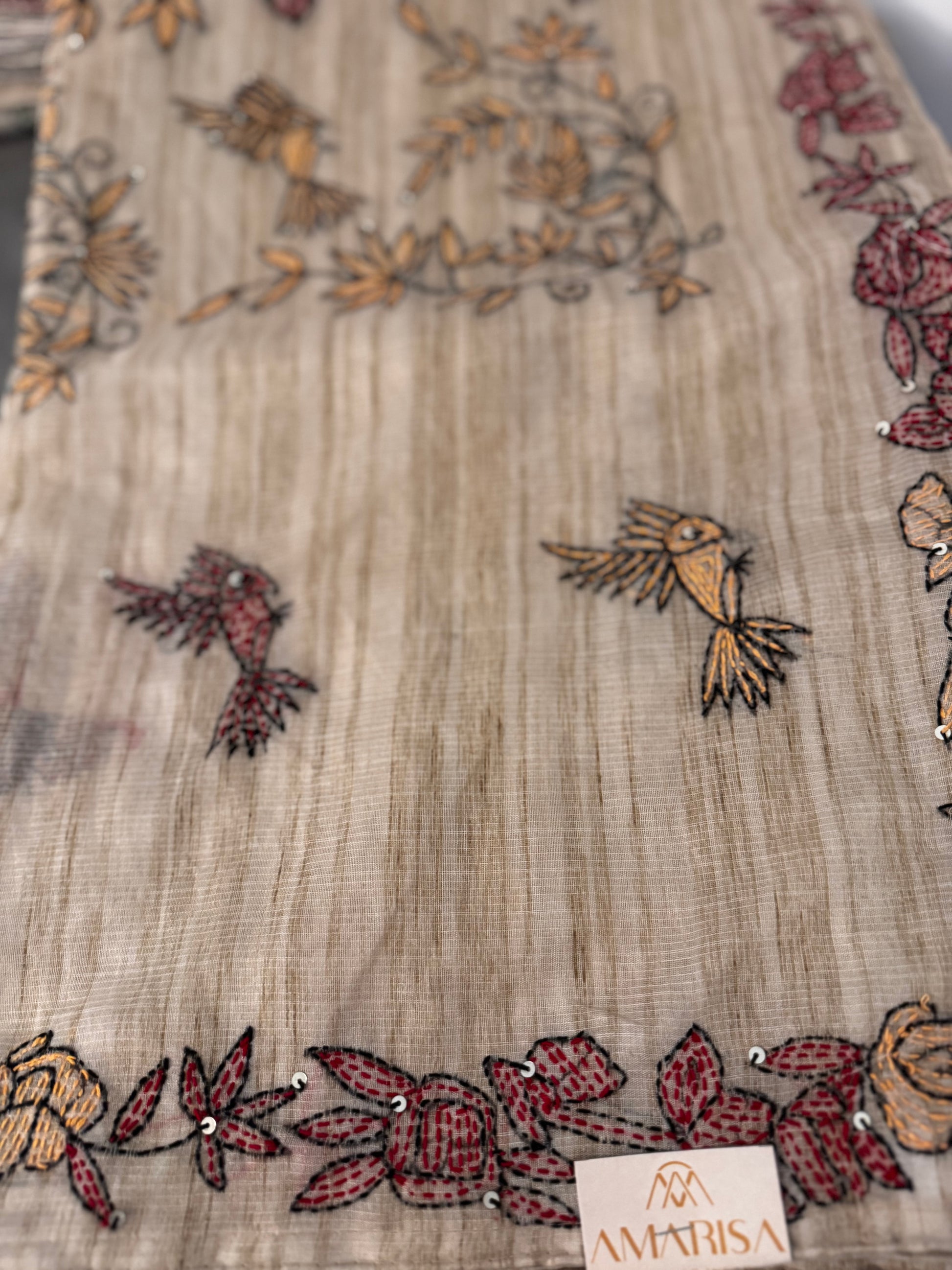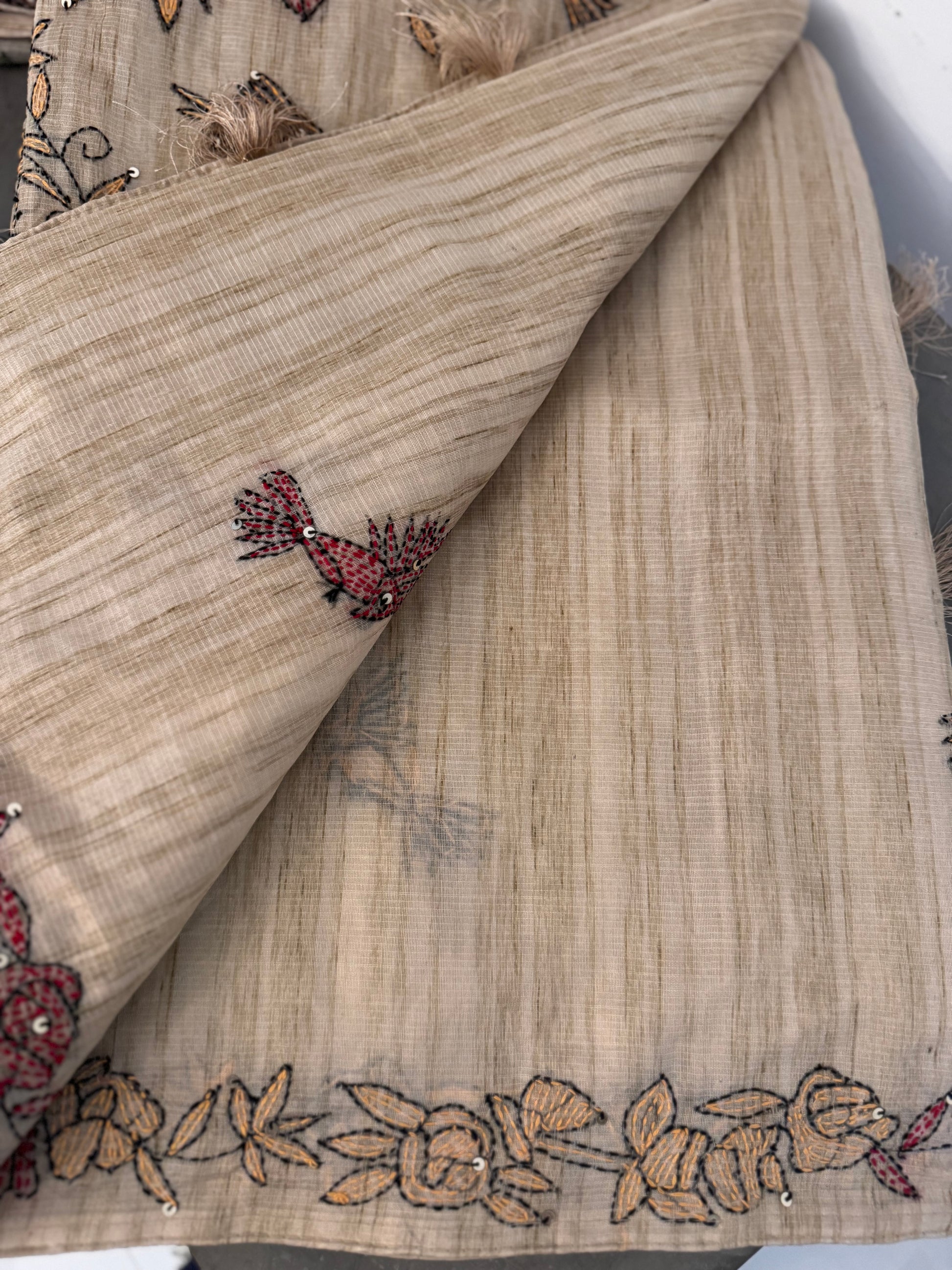 This semi tussar saree features kantha-style hand thread work with playful deer, birds and florals running all over the pallu and borders. The earthy beige body with subtle tussar slub lines gives a natural, handloom feel, while tiny sequins on the birds and flowers add a gentle festive sparkle. Lightweight and easy to carry, it’s perfect for intimate functions, work wear with a twist or artsy evening outings.