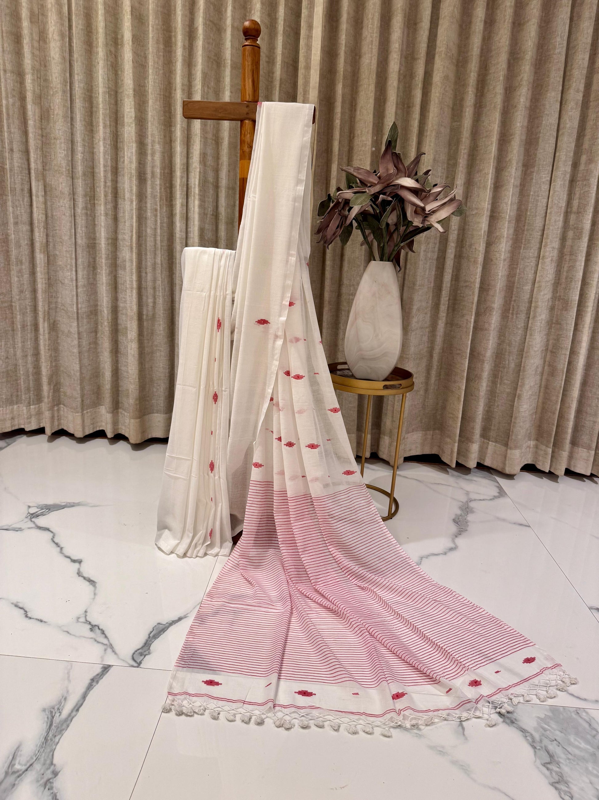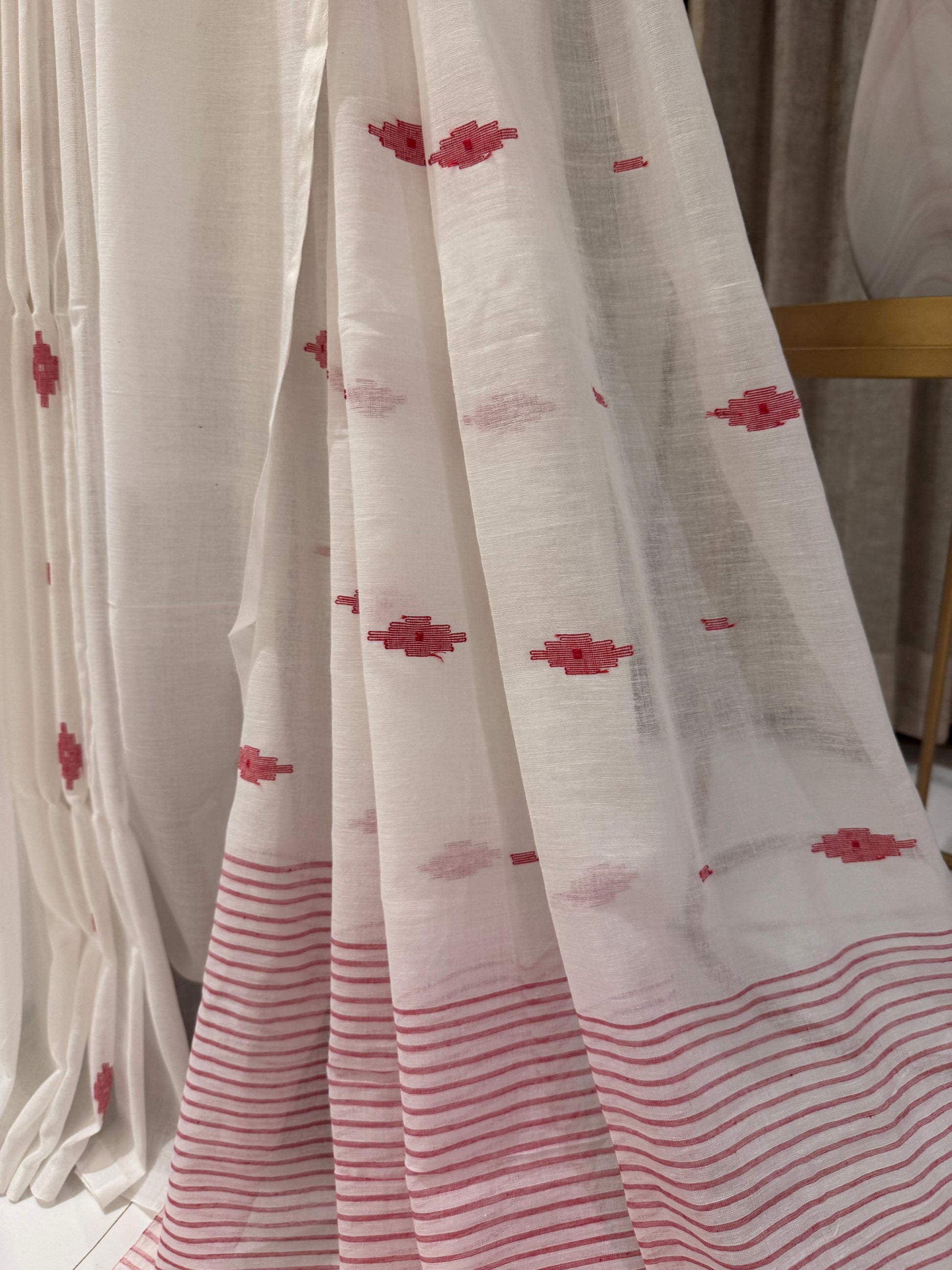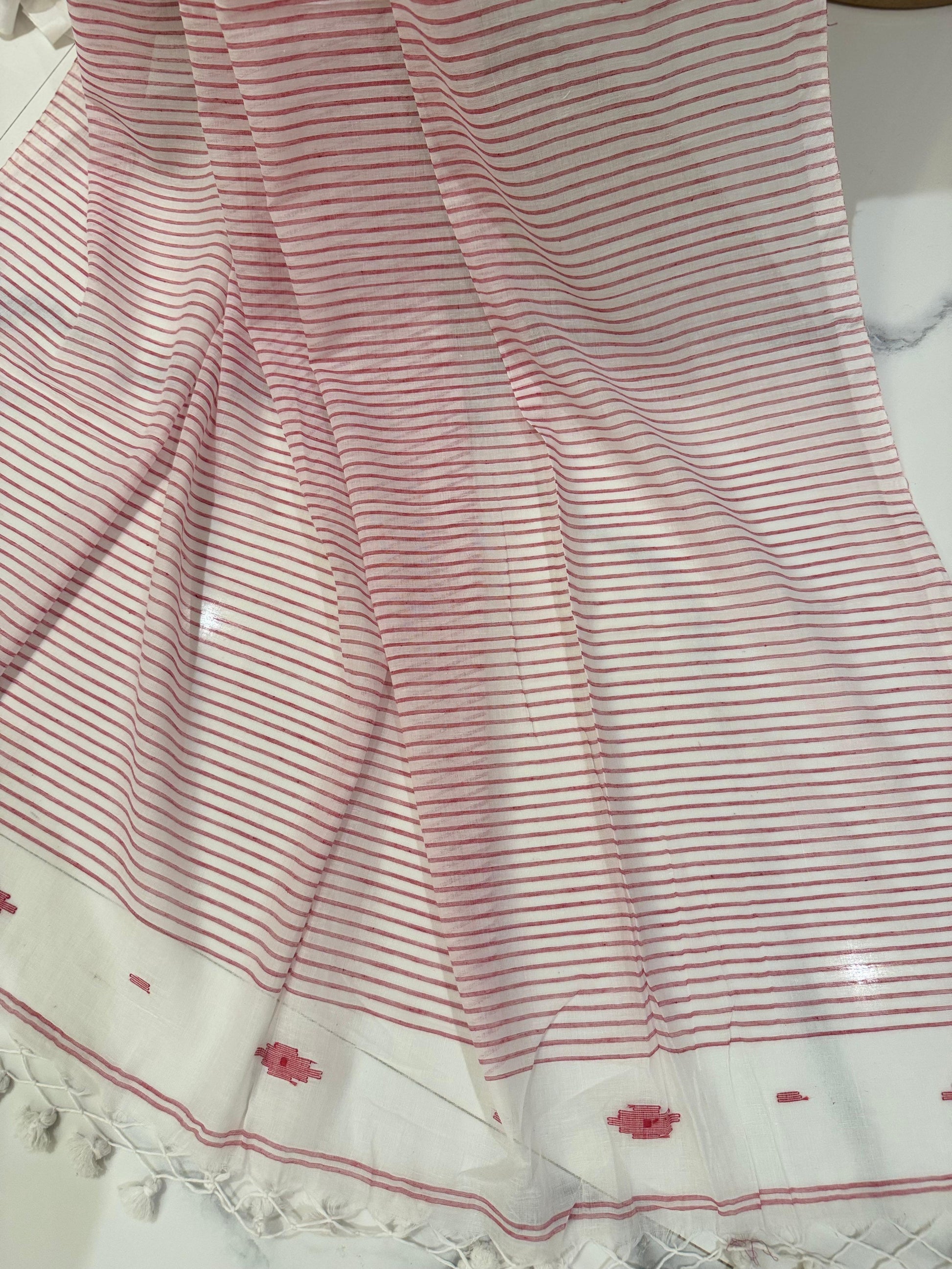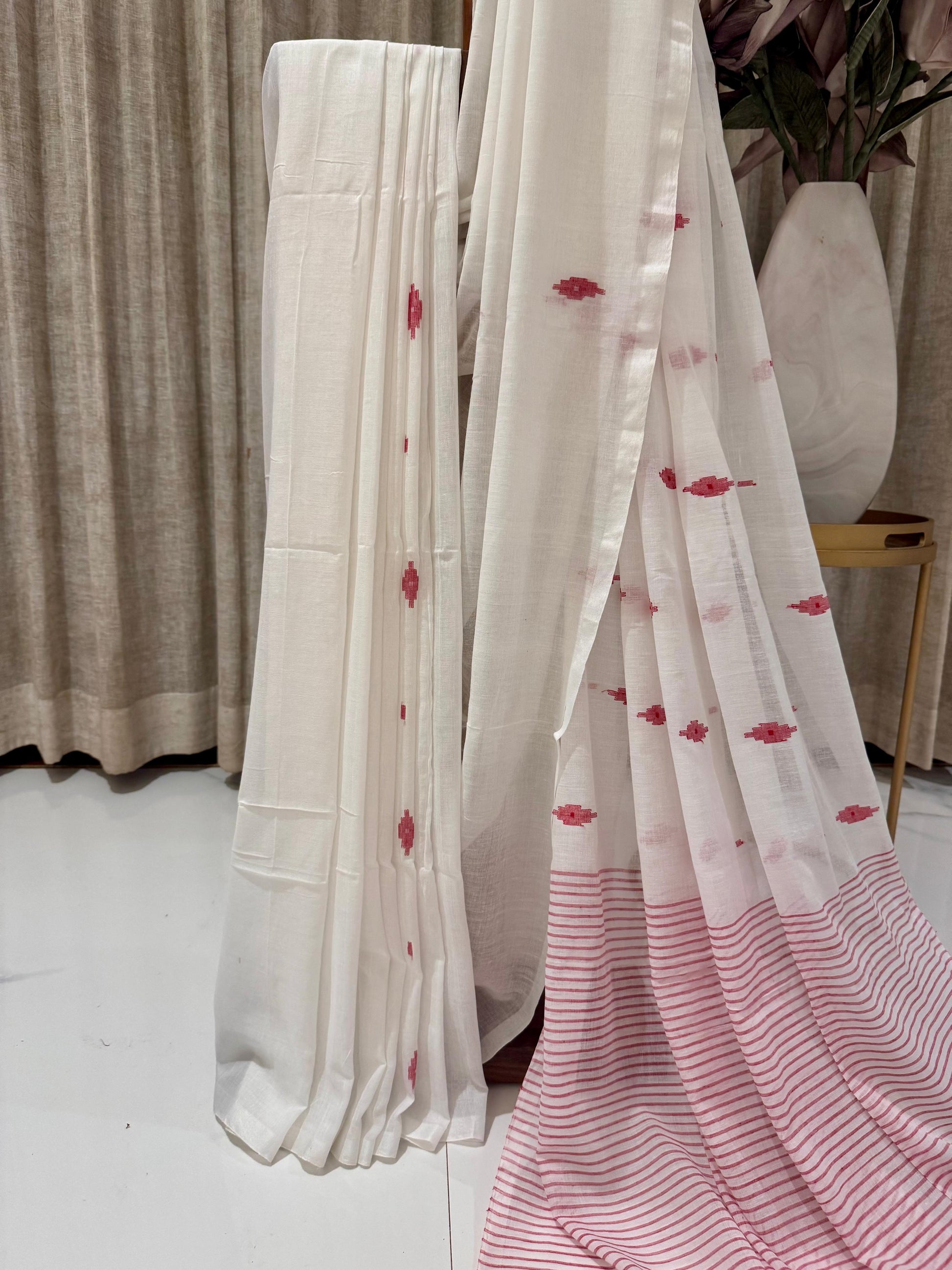 Design Details: The saree is adorned with red motifs and border patterns that highlight traditional artistry without the heaviness of embroidery.