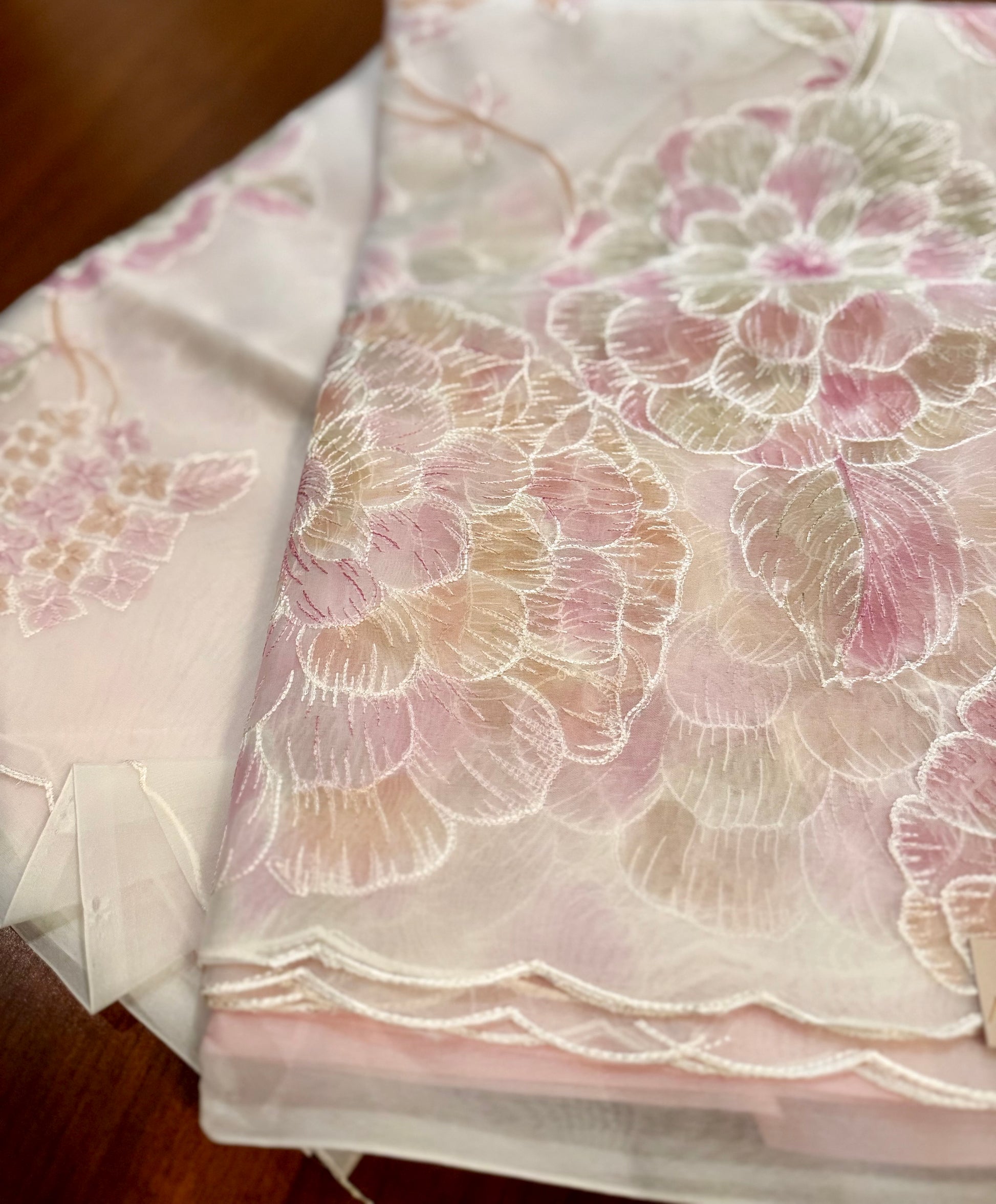 Step into sheer elegance with this breathtaking white organza blend saree, adorned with soft pastel floral prints and threadwork that looks dreamy from every angle. The delicate blend of pink, peach, and sage green creates a hand-painted effect, making the saree look ethereal and luxurious.